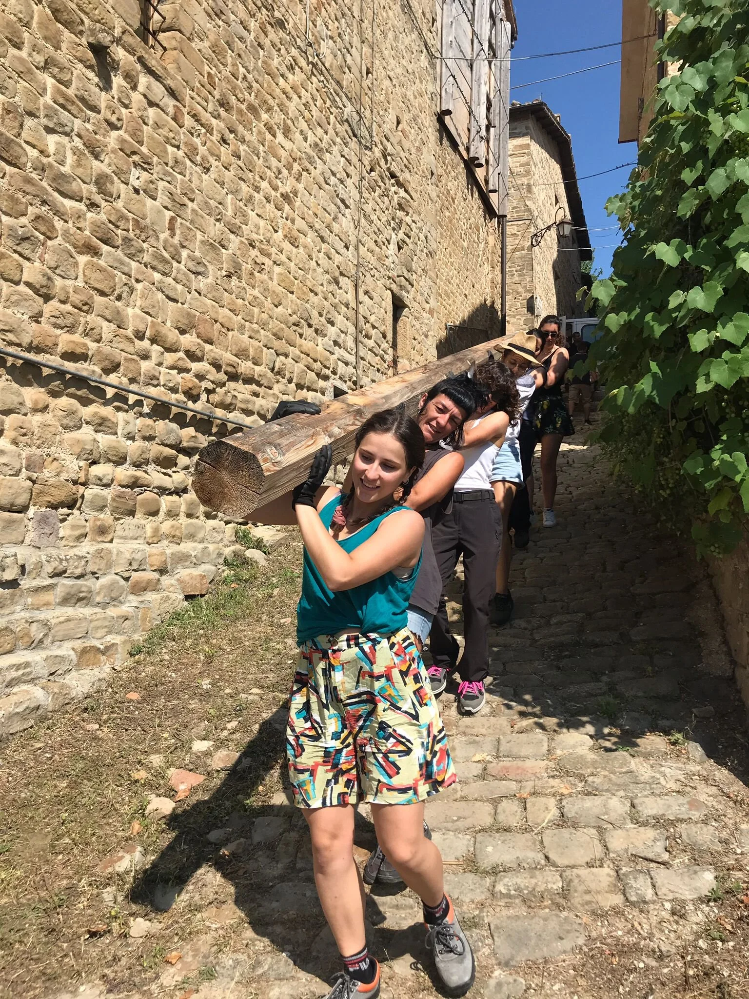 From 19th to 30th of July 2021 10 trainees attendend the Workshop BIØN² #2 Design&Build for Disassembly in the municipality of San Ginesio, province of Macerata, Italy. The team was welcomed by the members of G-Lab laboratorio di idee, a local youth association, by the municipality and by the project’s main stakeholde, the prior of the confraternity of the Sacconi of San Ginesio. In this edition the workshop is also one of a cycle of three workshops of the Master Circular Architecture: Shapes and Methodologies of the University of Camerino.