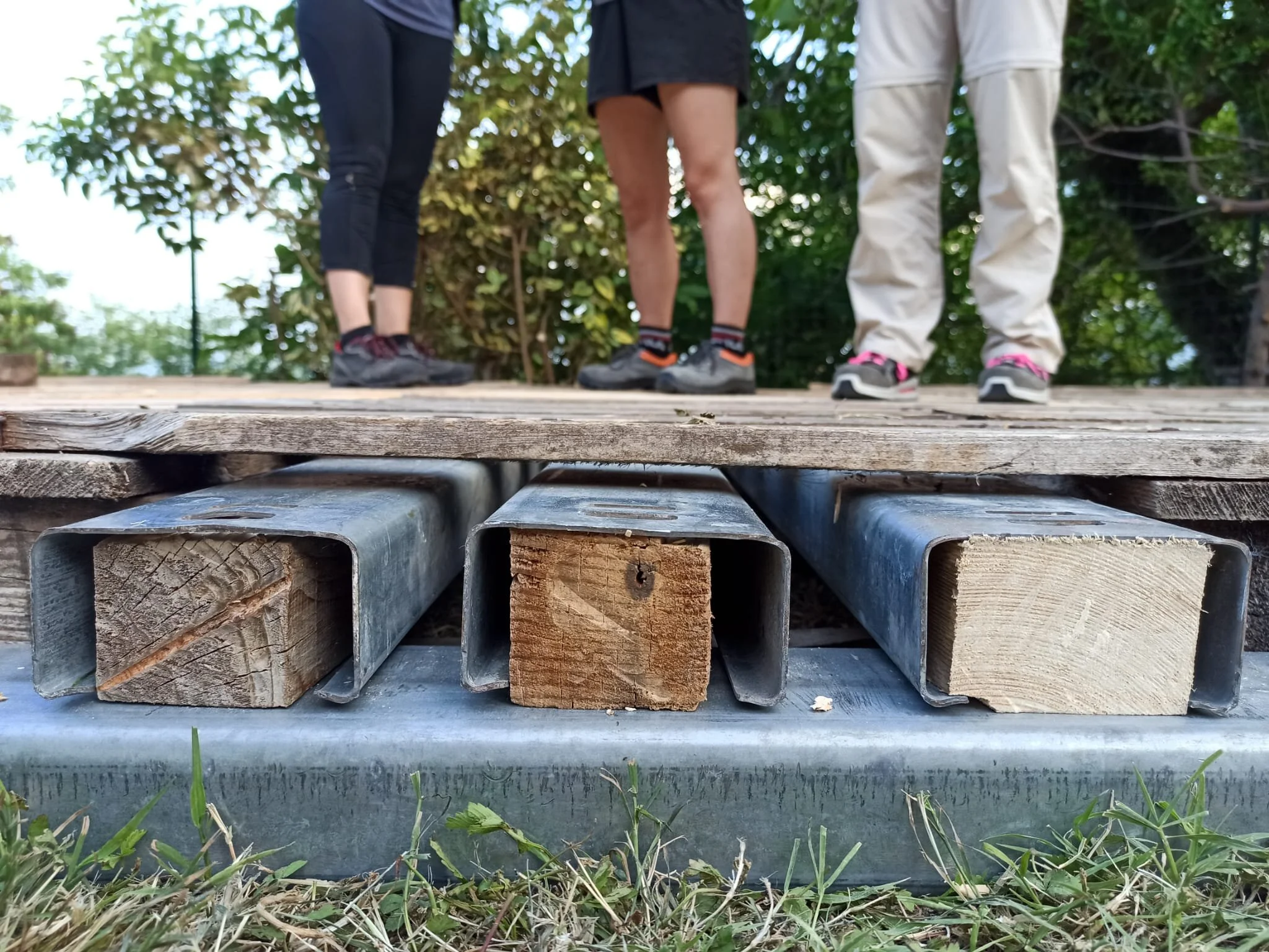Thanks to the great work of the participants the next three days were sufficient to put in place the main structure of the platform and some wood finishing elements, as well as doing some testing for the flooring and the seating elements. The next week will be dedicated to the anchoring of the floor and to the assembling of some chairs and tables for the whole garden.